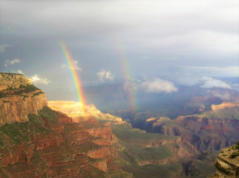 That is when the scene began to change – swiftly and unexpectedly. One by one thin streaks of sunlight fought their way through the dark, overcast sky. What began as a trickle grew quickly to a torrent of light shafts, widening before our eyes as they traveled to the floor of the deep canyon. Thick billows that had filled the mammoth gouge in the earth’s surface like bubbles in a bathtub began to lift and dissipate. The deep canyon, with its colorful walls and rock formations, abruptly burst into glorious view. Then, with a startling suddenness, a brilliant beam of light streamed through an unseen aperture in the clouds, coming to rest elegantly on a nearby ledge – and within that beam a rainbow appeared, and then a double bow showed itself against the vast splendor of the now-visible canyon. It was a spectacular sight to behold, and there were only two people on the planet who saw it.