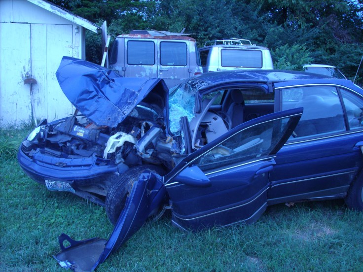 When I left the accident site I drove on to Rogersville, to the scrapyard where I knew the car had been taken. I felt the color drain from my face when, from the highway, I first caught site of the tangled, blue mass of steel sitting in plain view behind a barely-upright metal building. I parked on a gravel drive nearby and walked slowly towards the maimed vehicle.