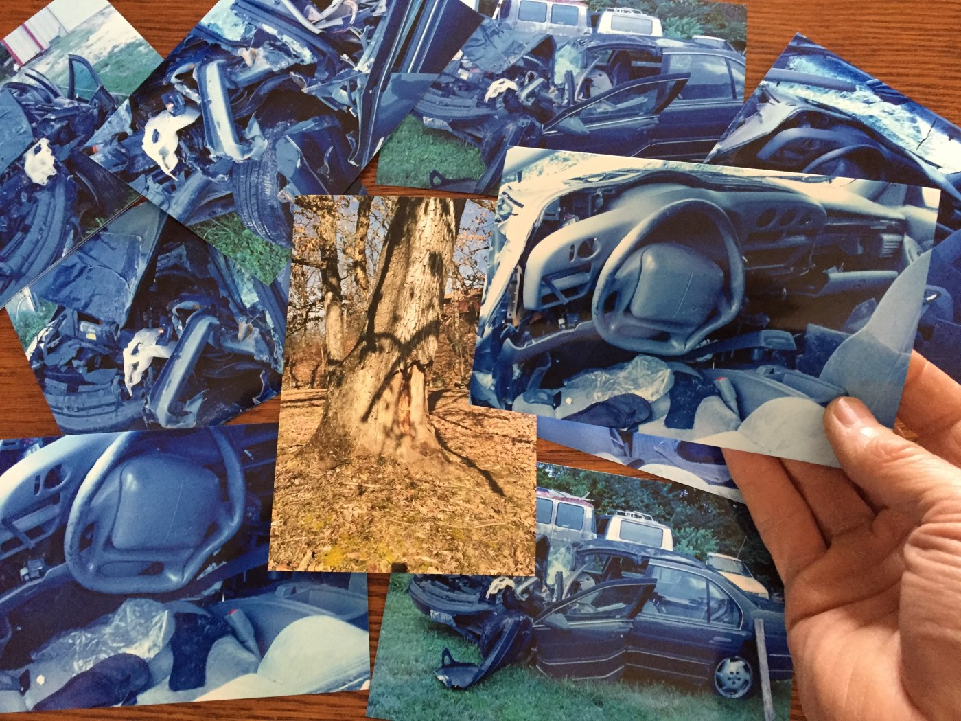 A few weeks ago I was doing research for an unrelated writing project when some pictures in a folder on one of my bookcases caught my eye. They were the photos of the wrecked Lumina that I took at the scrapyard the day after Olivia’s accident, along with a photo of the scarred tree that I had taken some time later. I spread them out on the coffee table in our living room and stared at them for several minutes.